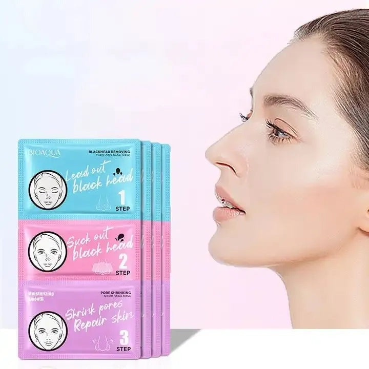 The BIOAQUA Blackhead Remover 3-Step Sachet is an easy-to-use, travel-friendly treatment designed to extract blackheads, cleanse pores, and tighten the skin in just three simple steps. Each sachet includes individually packed treatments to open pores, remove impurities, and soothe and shrink pores for a visibly smoother and clearer nose. Ideal for oily, combination, and acne-prone skin.