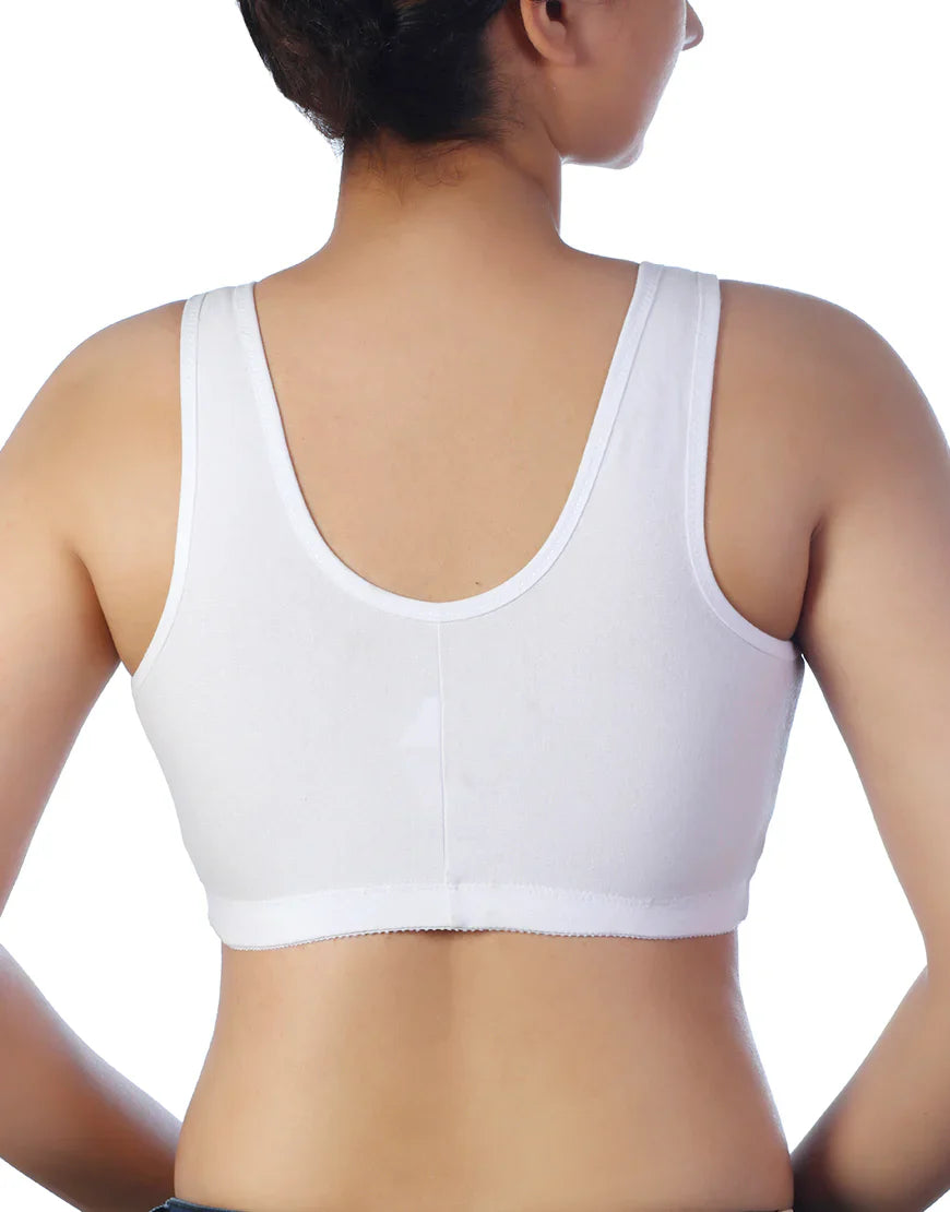 This medium-impact sports bra provides full coverage. It has wide straps and a racer back pull-on style. It comes with a removable pad and wide waistband for good support.