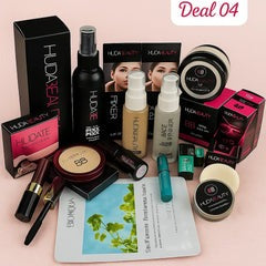 The products appear to be a mixed collection of beauty essentials, mostly branded as HUDA BEAUTY (though some packaging suggests they may be imitations or inspired products). The items are arranged neatly on a green grass-like background.